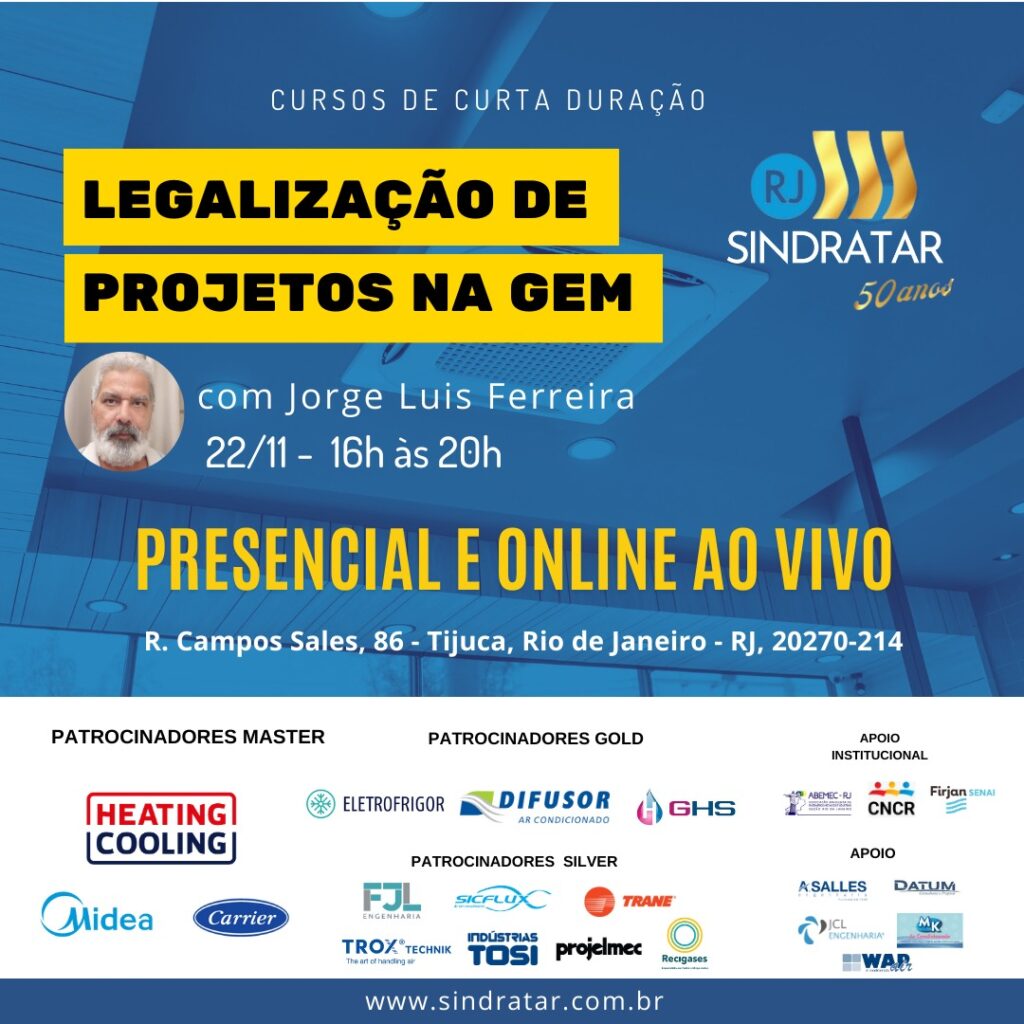 Curso sobre Projetos de AVAC-R no Rio de Janeiro, PRESENCIAL e também na versão ONLINE e ao vivo.